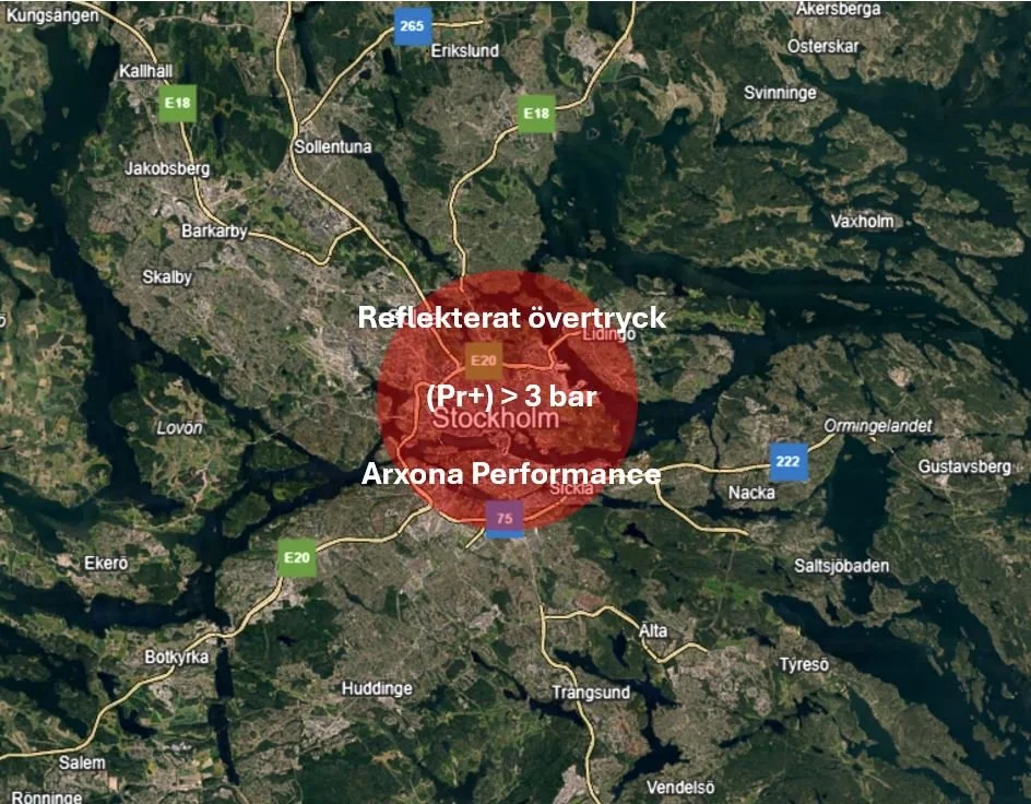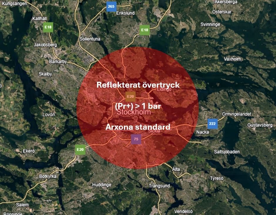 Det röda området har ett övertryck som överstiger Arxona performance på 3 bar. Bor man inom det röda området bör man överväga att bygga med en högra skyddsklass.